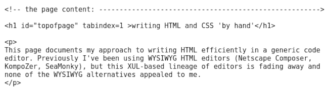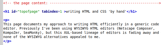 This page documents my approach to writing HTML efficiently in a generic code editor. Previously I've been using WYSIWYG HTML editors (Netscape Composer, KompoZer, SeaMonky), but this XUL-based lineage of editors is fading away and none of the WYSIWYG alternatives appealed to me.